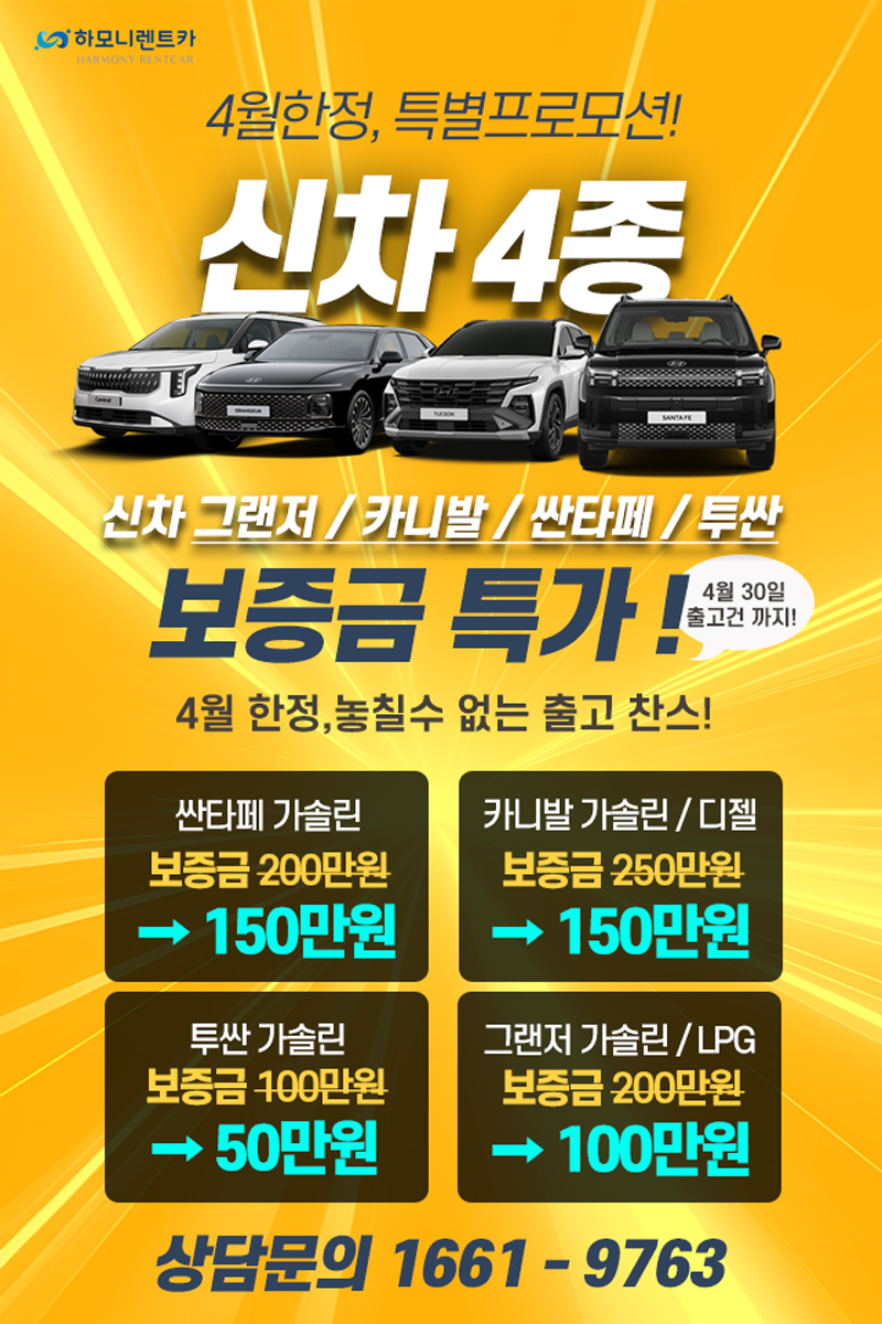 4월 한정, 신차 4종 보증금 특가 세일!